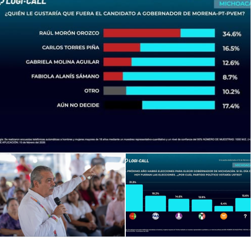 Morelia, Mich., a 17 de febrero de 2026.- En vísperas de que Morena defina a su Coordinador Estatal de Defensa de la Cuarta Transformación, el senador Raúl Morón Orozco se posiciona con una ventaja inalcanzable, según los datos más recientes de la encuestadora Logi-Call, que en su estudio de febrero lo coloca a la cabeza de las preferencias internas con un sólido 34.6%, cifra que duplica a la su competidor más cercano.